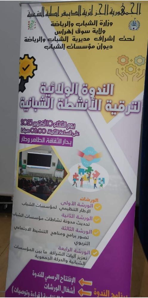 Conformément aux programme du ministre de la jeunesse et des sports, relatif à l’entame de la saison d’animation de l’exercice 2023/2024, la wilaya de Souk-Ahras a organisé mardi 10 octobre 2023, une conférence qui a été réservée à la promotion des activités des jeunes. La cérémonie d’ouverture a été supervisée par le wali au niveau de l’amphithéâtre « Tahar Ouattar » en présence des autorités locales et un grand nombre de jeunes de la wilaya. Les animateurs de ce rendez-vous, ont été unanimes pour annoncer que ce regroupement « Vise à renforcer les mécanismes de partenariat entre les différents établissements des jeunes et le mouvement associatif ». Ce rassemblement a aussi pour but de s’enquérir de la réalité des activités de cette catégorie de citoyens, dans le but de détecter les vrais problèmes, tout en proposant des solutions adéquates, dans la mesure d’élaborer une stratégie nationale claire dans tous les secteurs, particulièrement celui des « Activités socio-économiques et éducatifs des jeunes».