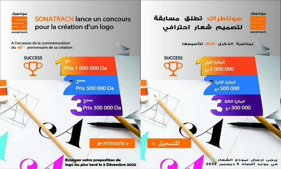 « Dans le cadre de la célébration du 60e anniversaire de la création de Sonatrach, le 31 décembre 2023, le Groupe Sonatrach organise un concours ouvert à tous les citoyens pour la conception d’un logo officiel dédié à cet évènement », indique le communiqué.